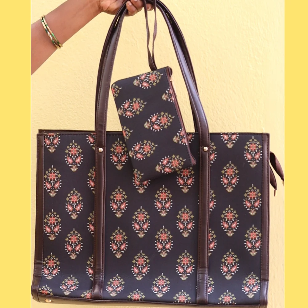 Its elegant printed design adds a fashionable touch, making it suitable for both casual and professional settings. The included mini pouch helps keep smaller items neatly organized.
