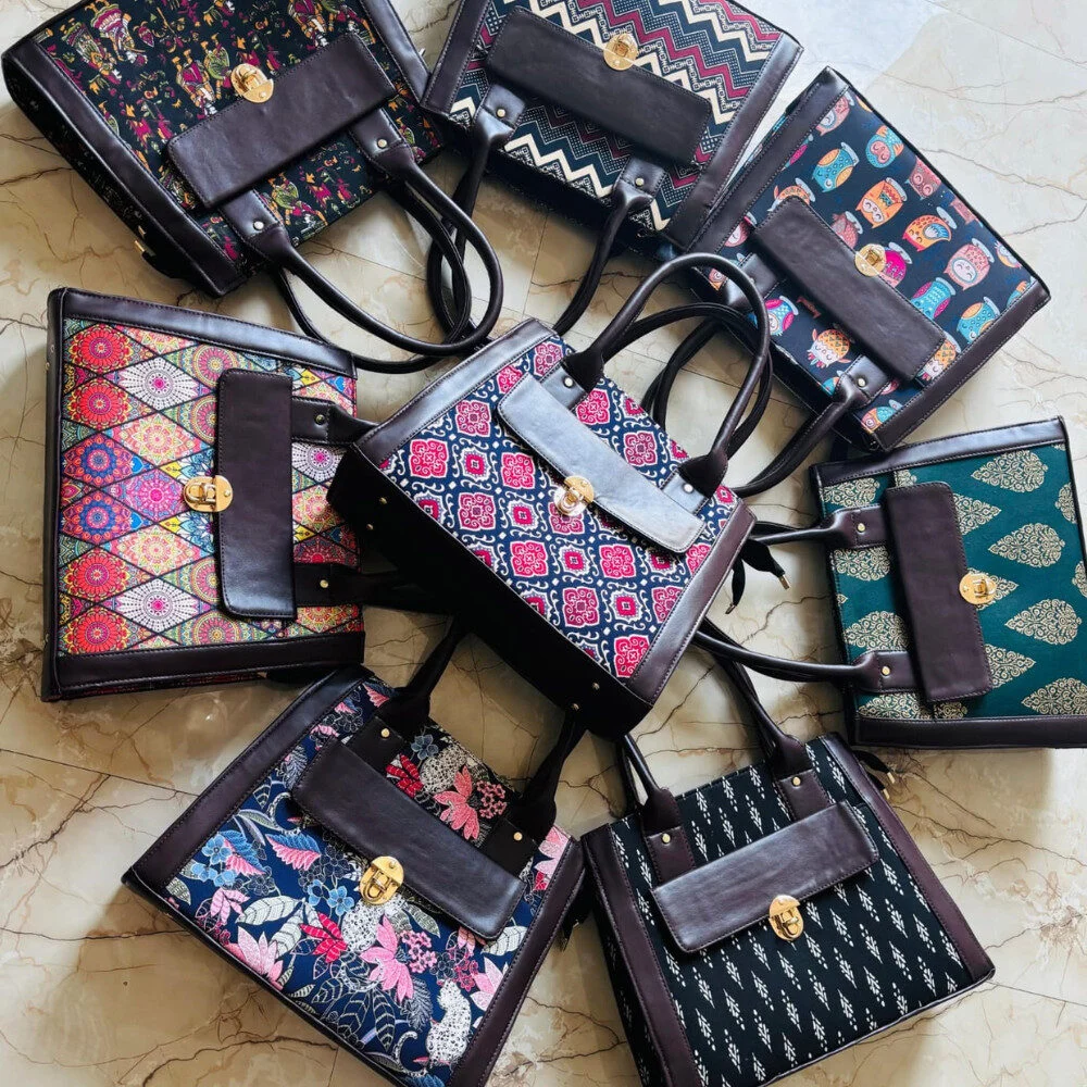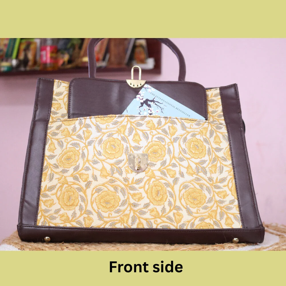 Made from durable material with traditional floral block print and contrast leatherite panels, this bag blends style with function. The front lock flap and rear slip pocket provide added utility for quick-access items like ID cards or notebooks. Perfectly structured with a wide base and sturdy handles, this bag sits upright on your desk and carries the weight of your day with ease.