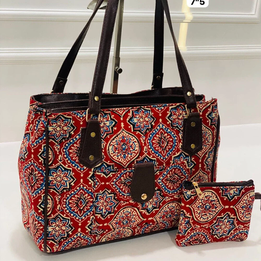 Made from handcrafted fabric with vibrant prints, the bag comes with sturdy leather-look handles and an additional matching coin pouch for quick access to cash, cards, or keys. Its durable structure ensures long-lasting use, making it an excellent choice for teachers, professionals, students, and travel enthusiasts who need space without compromising on style.