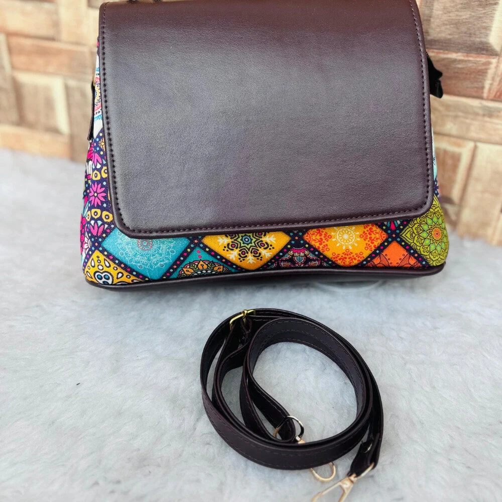 The structured silhouette Indo Wester Sling with a premium leather flap and ethnic printed fabric base makes it a standout accessory for both festive and everyday looks. Its triple-compartment interior ensures effortless organization, so you can carry all your essentials without the clutter.