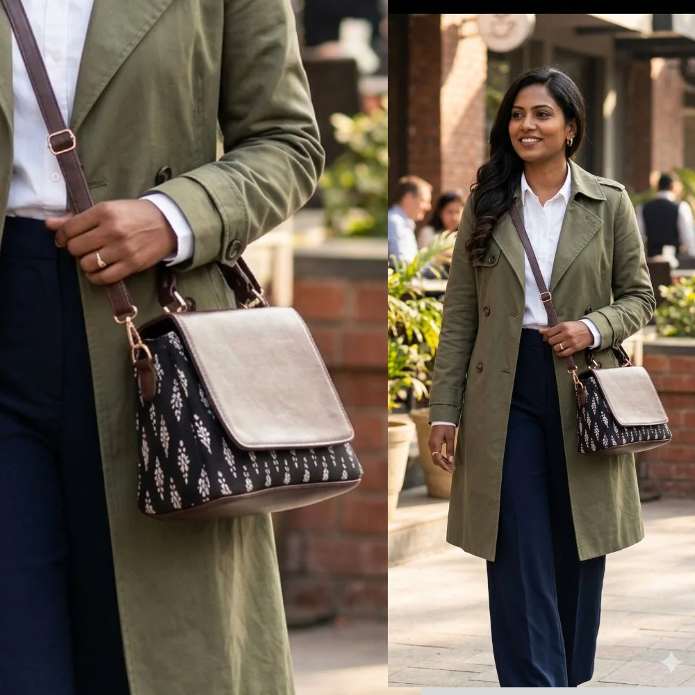 The structured silhouette Indo Wester Sling with a premium leather flap and ethnic printed fabric base makes it a standout accessory for both festive and everyday looks. Its triple-compartment interior ensures effortless organization, so you can carry all your essentials without the clutter.