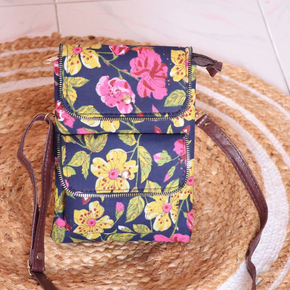 This Mobile sling is made with intricately patterned sustainable fabric, it blends traditional craftsmanship with modern practicality. The five thoughtfully placed pockets allow you to organize your belongings with ease — no more digging through your bag to find small items.
