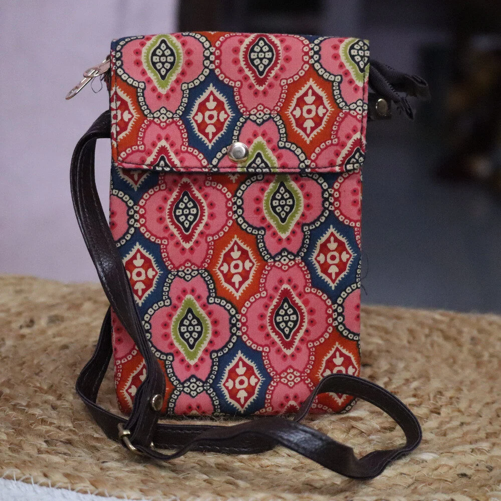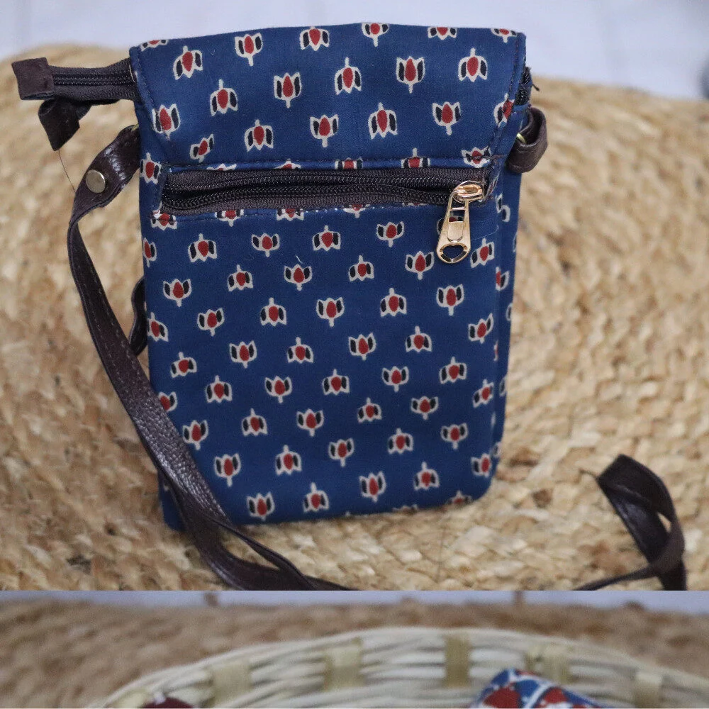 Keep your essentials close and your hands free with this stylish mobile sling bag, designed for both function and fashion. Made with soft handblock printed cotton fabric, it features two secure zippered compartments and a front flap with button closure to keep your phone, cash, cards, keys, and lip balm safe and organized.