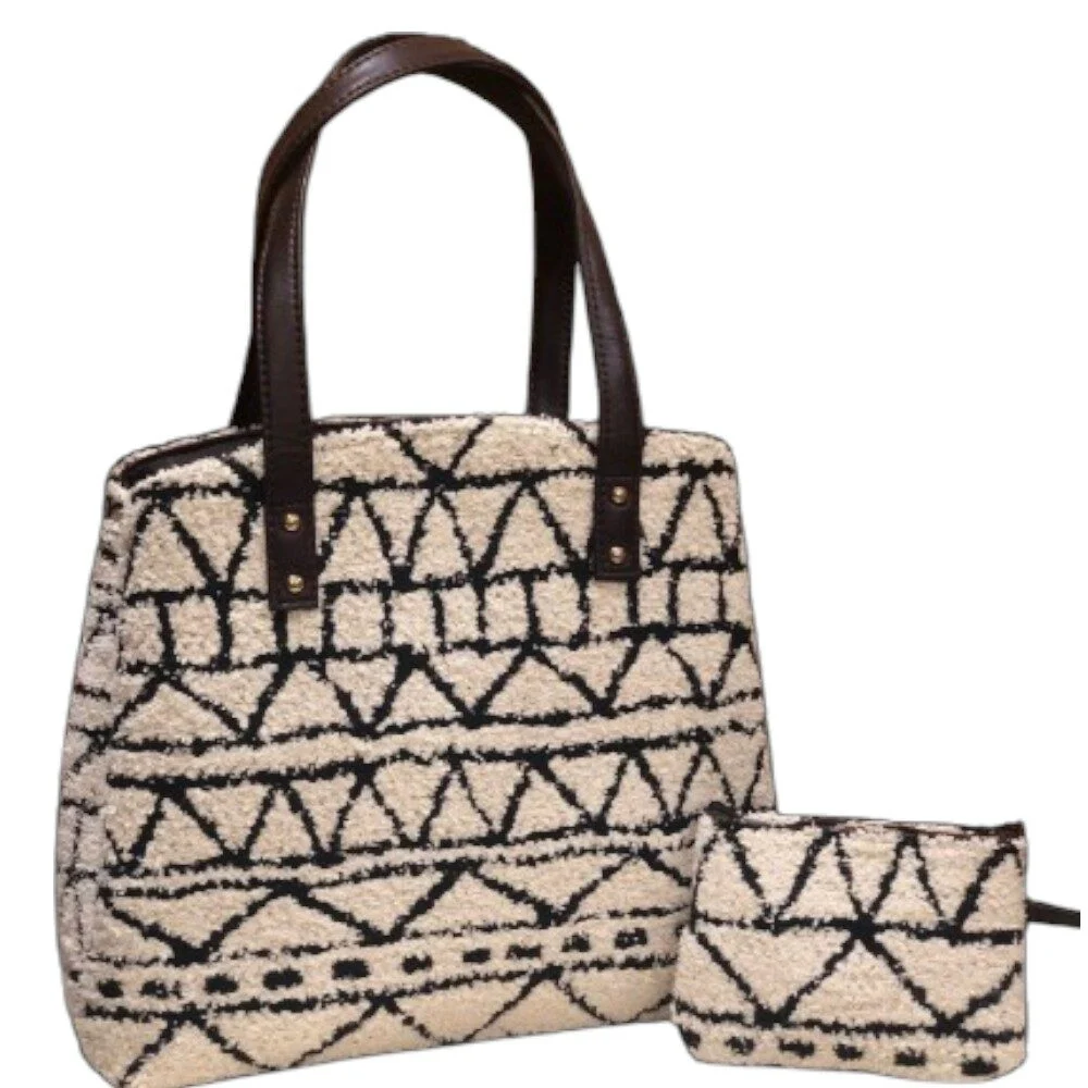 The set includes a coordinated pouch—ideal for storing essentials or using as a ladies purse. With its sturdy faux leather handles and high-quality handwoven texture, this sustainable bag is a must-have addition to your wardrobe.