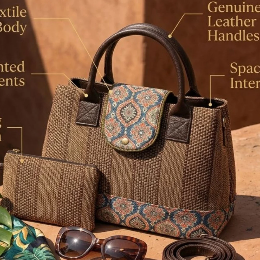 Elegant Vegan Leather Flap & Handles: Adds a chic, durable finish.