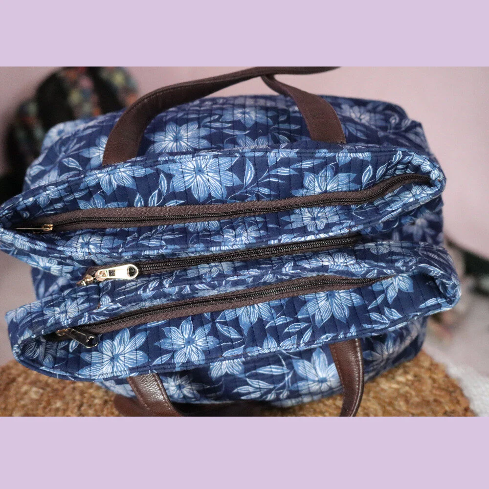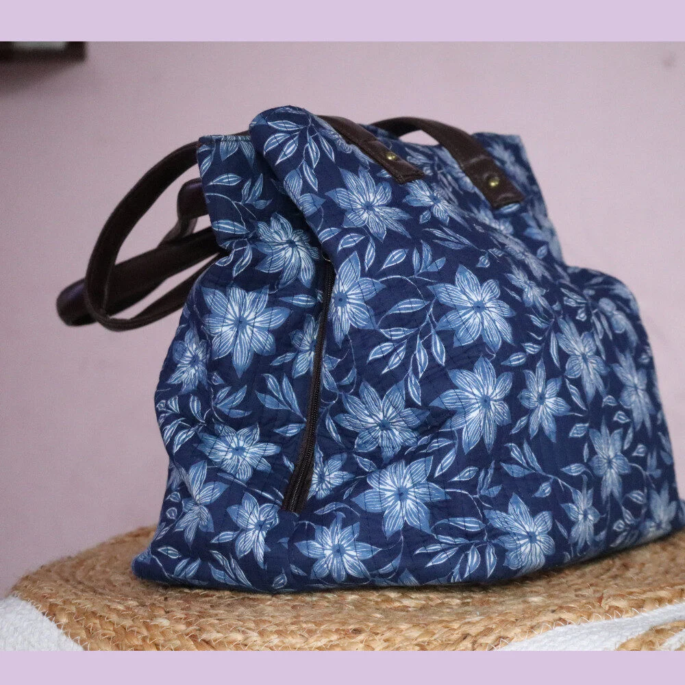 Made from durable, soft quilted fabric, it’s lightweight, foldable, and completely washable, making it ideal for hospital use, day trips, or baby travel. The stylish blue floral design is paired with reinforced faux leather handles for added strength and easy carrying.